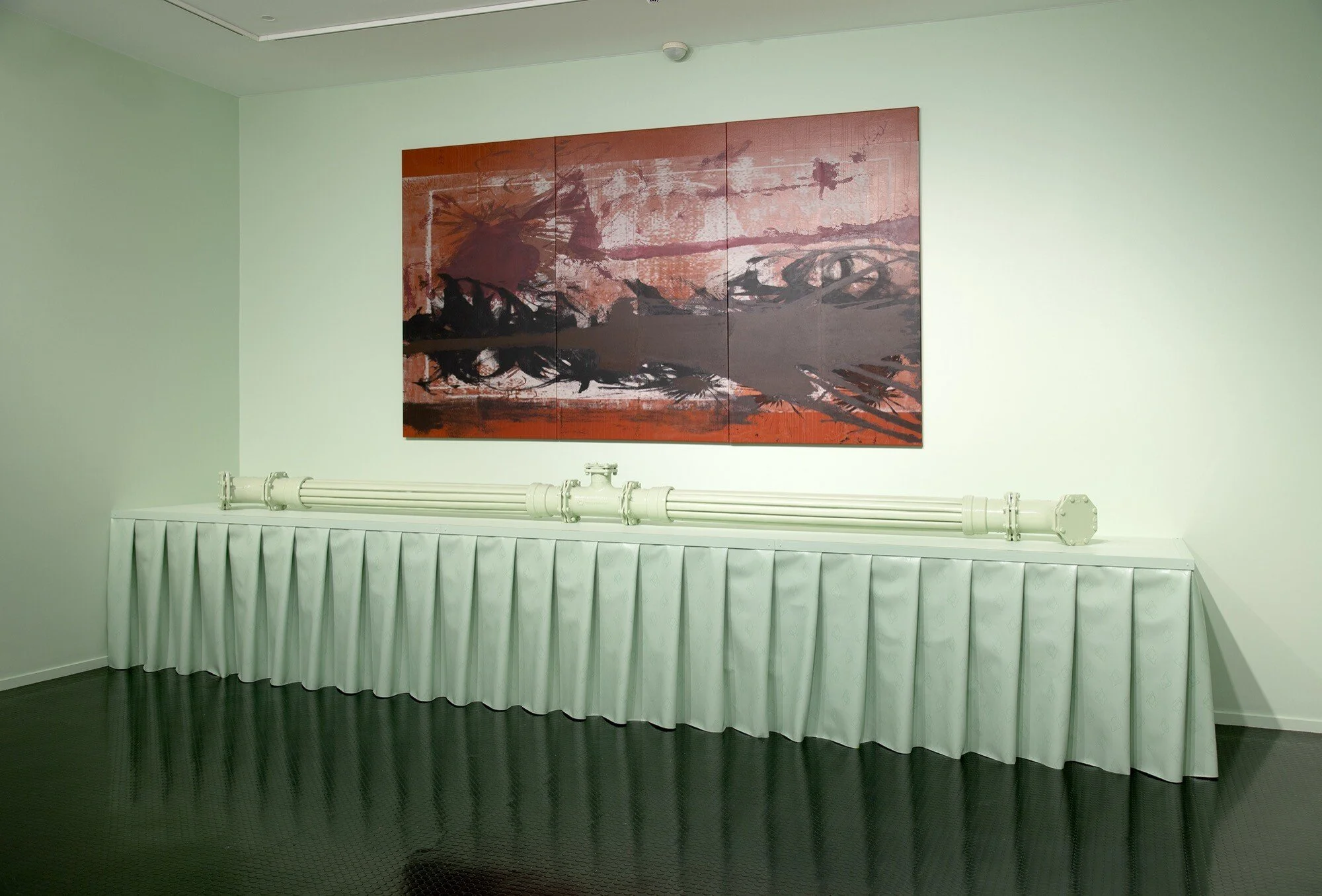 Installation view, Alexandra Peters, The Graven Image, 2025, The Warrnambool Art Gallery. Top: Alexandra Peters, Sunset Clause, 2025, acrylic, pigment and water-based ink with screen-print medium and paste on vinyl, 200 x 360 cm (3 panels, each 200 x 120 cm). Middle: Alexandra Peters, Foreign Line Extracation V (Overture), 2025, acrylic, vinyl, polyurethane ‘open cell’ foam, ductile iron, pine, steel, enamel, 27 x 460 x 38 cm. Below: Alexandra Peters, Polity (Latent State), 2025, acrylic with screen-print medium and paste on leatherette, pine, steel, enamel, 100 x 650 x 120 cm. Courtesy of The Warrnambool Art Gallery